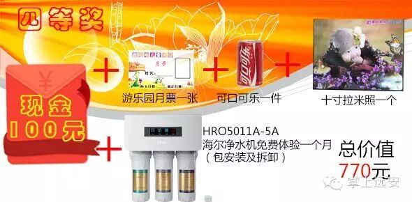四等奖十名:现金100元+价值250元的儿童乐园月票一张+价值60元可口可乐一件+爱价值100元的十寸拉米一个+价值360元的HRO5011A-5A净水机免费体验一个月(包安装及拆卸) 总价值:870元