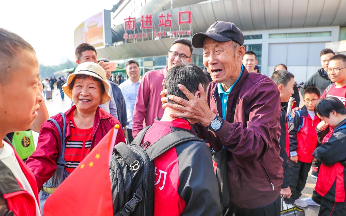 2点刚过,10个孩子终于出站了!他们在特教老师的带领下,排队走出出站口。袁振江、高庆仙高兴地和每一个孩子拥抱,眼泪夺眶而出。 “爷爷奶奶,我们终于来北京了,终于能见到您了!”孩子们围绕在老人身边。他们之中,最小的只有8岁,最大的16岁。大部分远安特校的孩子虽未亲眼见过袁爷爷和高奶奶,但学校通过写信、寄照片和视频,让孩子们与老人保持密切联系,虽然没见过面,但是特教学校的每个孩子都“认识”老两口。 远安特校校长张孝勤早已汗湿衣衫,他手里满满当当,全是学生送来的礼物。“听说我们要来北京见袁爷爷和高奶奶,好多学生都托我们带礼物。还有已经毕业的学生,也特意从宜昌市区坐车赶回来。” 有听力障碍的宋绍阳是绘画能手,他用整整一周时间绘制了一幅《远安美丽乡村》油画,精心装裱后送到北京。20多年前首批接受捐赠的学生刘芳,如今已经自食其力,还有了美满的家庭。听说远安特校要来北京,刘芳去家乡茶山上采了最鲜最嫩的茶叶,她的丈夫负责炒制,托校长送到老人手上。11岁的黄蓉越的礼物很特殊,是一张奖状,今年,他凭借吹笛子获得了湖北省残障少年儿童乐器比赛三等奖。