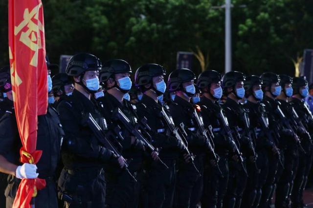8月26日晚8时,武汉首义广场上警灯闪闪,“枭龙”、“剑齿虎”装甲车、“霸道”巡逻车、智能巡控车、“汉警快骑”摩托车列阵齐整。武汉市公安局各直属单位负责人组成的警官方阵,以及机关民警、交警、特警、巡警、辅警组成的5个民警方阵,500名警力神情庄重。