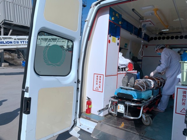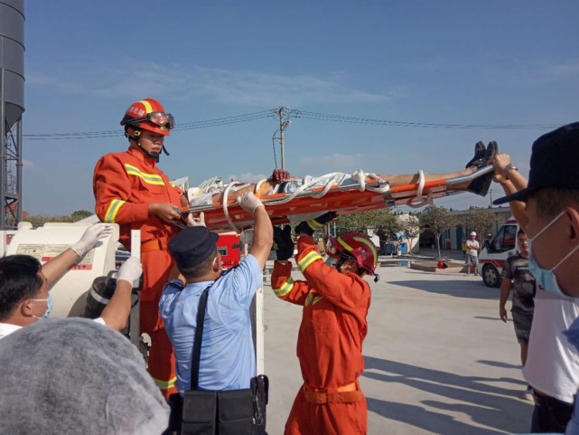 到场后,现场指挥员立即安排一名救援经验丰富的消防员通过安全梯爬上水泥罐顶进行侦查,发现被困人员身上有大量血渍,被困人员因为失血过多处于昏迷状态。时间就是生命,现场指挥员立即组织两名携带救援装备联合医护人员一同乘坐云梯车升至水泥罐顶进行高空救援,其他人员对现场进行警戒,防止发生意外。云梯车升至水泥罐顶后现场消防员协助医护人员对被困人员身上的伤口进行包扎处置,随后用安全绳将被困男子的身体固定在担架上并小心翼翼的转移至云梯车上。经过近50分钟的紧张救援,消防员成功将被困男子抬至地面并送上救护车。