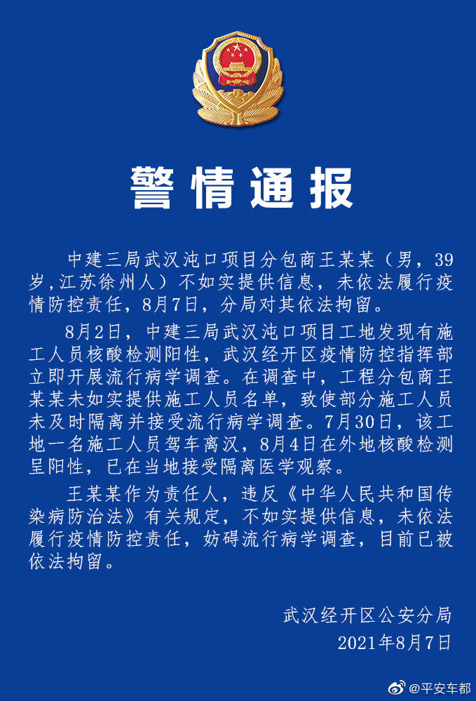 [宜昌] 武汉经开区警方对未履行防控责任一企业责任人依法拘留 |
