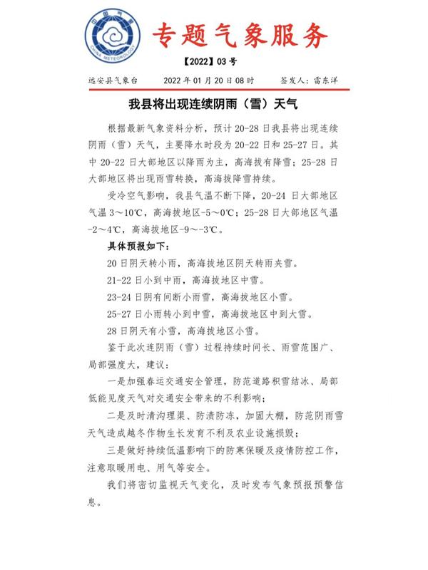 根据最新气象资料分析,预计20-28日我县将出现连续阴雨(雪)天气,主要降水时段为20-22日和25-27日。其中20-22日大部地区以降雨为主,高海拔有降雪;25-28日大部地区将出现雨雪转换,高海拔降雪持续。