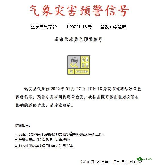 [远安] @ 远安人,1月27日最新道路结冰黄色预警,请大家加强防范! |