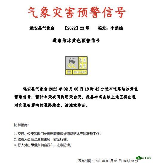 [远安] @ 远安人,2月8日最新道路结冰黄色预警,请大家加强防范! |