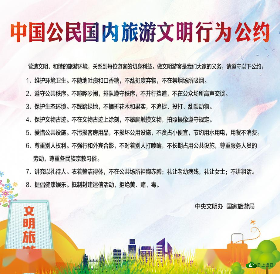 踏青、祭扫正当时, 在这里要提醒大家, 在尽情享受美景的时候, 请千万不要忘记文明旅游, 让文明与你一路相伴! 一、健康旅游。密切关注最新疫情防控政策,了解景区限量、预约、错峰要求,合理规划旅游线路和时间。旅行中做好自我防护,戴口罩、勤洗手、勤消毒,保持安全距离,积极主动配合旅游目的地检测体温、查验健康码、信息登记等疫情防控措施,不扎堆、不拥挤、少聚集。 二、文明旅游。维护环境卫生,遵守公共秩序,爱护文物古迹,尊重当地风俗*惯,不随地吐痰,不乱扔废弃物,不在禁烟场所吸烟,不在公众场所高声喧哗,让文明旅游成为一种新风尚。就餐时保持安全间距,积极践行“光盘行动”,杜绝舌尖上的浪费。 三、安全旅游。增强安全防范意识,预防意外事故发生,确保人身、财物安全。登山或参与游玩项目时应根据自身状况进行,避免过度激烈运动以及自身无法适应的活动,同时做好防护工作。自驾游要杜绝疲劳驾驶和酒后驾车,控制车速,注意礼让。 旅游是一项发现美、欣赏美、享受美的活动,更是一项创造美、展示美、传播美的活动,让我们携起手来,争做文明旅游的践行者、传播者、助力者。 |