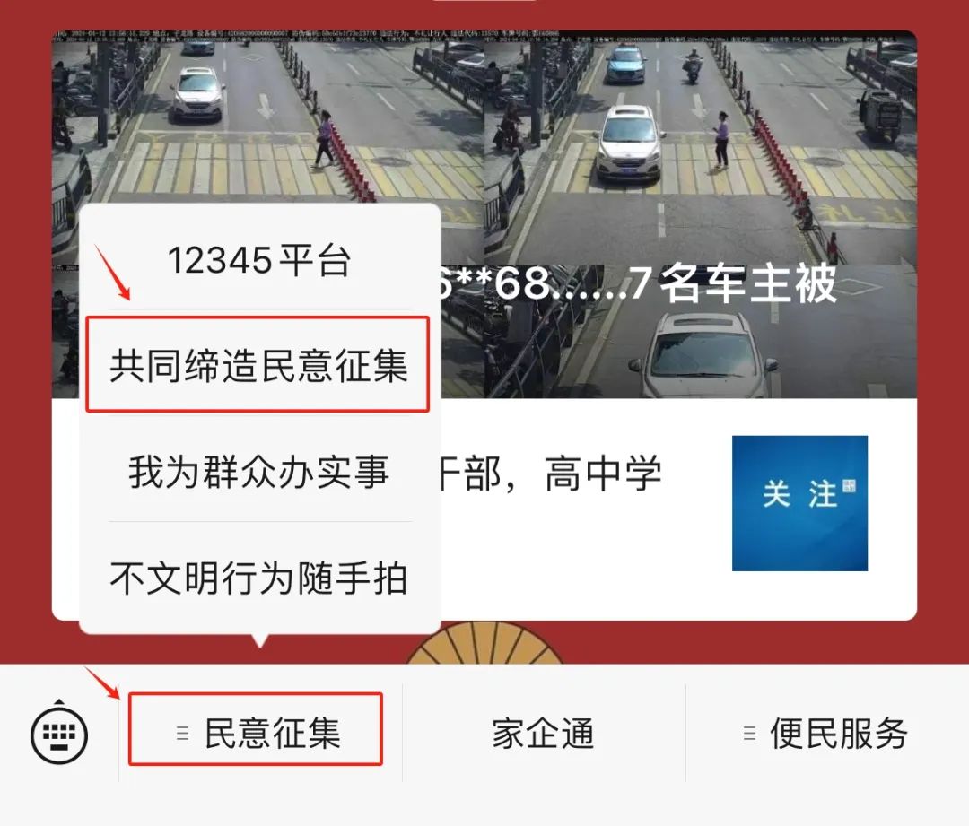 第二步 进入“雄风当阳”微信公众号 点击下方菜单栏【民意征集】 进入“共同缔造民意征集”进行留言