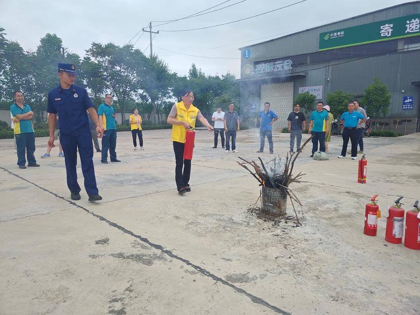 “易燃易爆危化品需要分类存放,仓库内禁止人员生活起居。”培训中,大队宣传人员组织参训人员集中观看了《仓储物流企业消防安全管理指南》警示教育片,结合仓储物流行业消防安全现状,深入分析了可能存在的消防安全风险隐患,宣讲了消防工作的重要性,就寄递点处理场地、仓储场地和营业办公场所用火用电用气、电动自行车停放及充电各环节需注意的事项进行了强调。“站在火源上风口方向,对准火焰根部……”室内培训结束后,宣传人员详细讲解了灭火器的种类、使用方法及注意事项,现场演示了正确使用灭火器的方法。部分参训人员在宣传员的指导下进行现场灭火实操,确保了参训人员都能够熟练掌握相关器材的使用方法及灭火技巧,有效地提高企业员工的防火灭火能力。