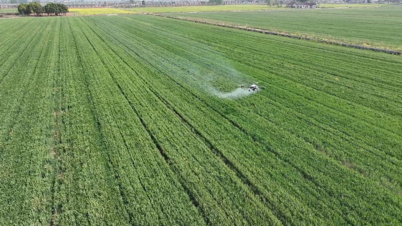 在草埠湖镇,万亩小麦排列整齐、长势良好,在春风的吹拂下泛起阵阵碧色麦浪。麦田上方,植保无人机正来回穿梭、喷洒药剂,开展小麦赤霉病防控。