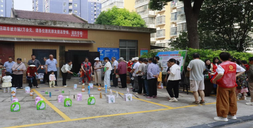 寓教于乐,套出环保新时尚。活动现场设置“趣味套圈挑战区”,居民通过正确回答垃圾分类知识题目获得套圈机会,将标有不同垃圾名称的“卡片”准确投掷到对应垃圾桶模型中。矿泉水瓶精准落入蓝色“可回收物”桶、废电池稳稳进入红色“有害垃圾”桶……游戏过程既充满竞技乐趣,又考验着居民对分类标准的理解。现场设置的图文展板同步科普,工作人员实时指导纠错,让垃圾分类要点化作通俗易懂的生活指南。