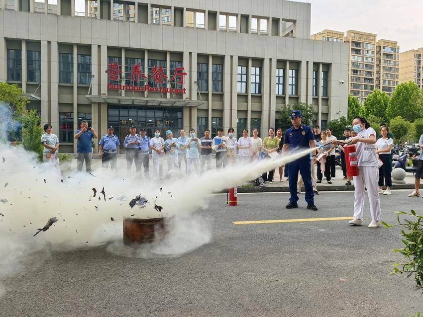 实操培训环节,大队宣传员手把手指导医护、安保人员正确使用灭火器和消火栓,现场组织参训人员开展灭火器、室外消火栓灭火演练。