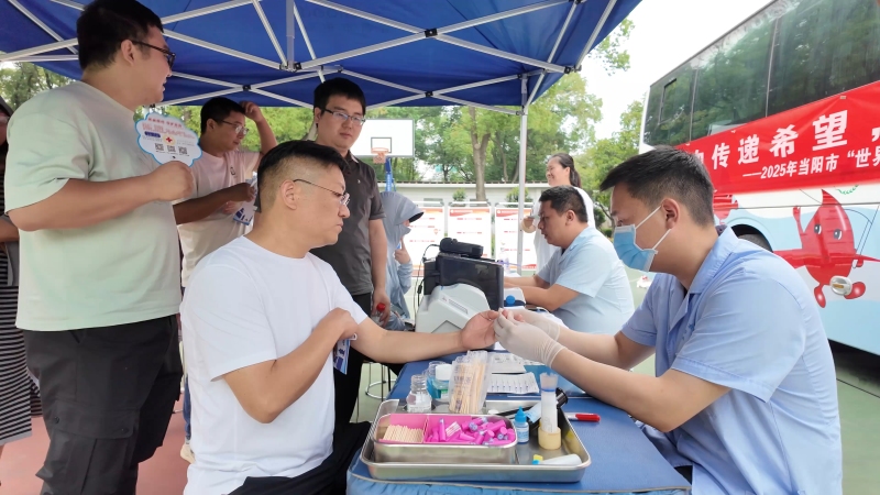 在当阳市玉泉街道办事处、当阳市委篮球场,工作人员早早布置好场地,献血者们井然有序地排好队,参与献血活动。大家在工作人员引导下,依次完成扫码登记、体检初筛、献血等步骤。 活动现场,不同年龄、不同职业的献血者们,用质朴的话语讲述着自己坚持献血的初心与故事。今年54岁的刘华已是第19次参与无偿献血了,他说:“我们每个人的血液都可以再生,但患者的生命却经不起等待。我曾经是一名军人,这也是我延续奉献精神的一种方式。”今年30岁的唐晓第一次献血是18岁,如今已累计有接近4000毫升的献血量,“献血对于我来说,就是帮助别人的一件事情。现在我有了自己的宝宝,也希望将这份善意传递下去。”献血者严俊坚定地表示:“我今年39岁,献了4次血,大概有1600毫升。我们作为党员应该带头把无偿献血精神传承下去。”