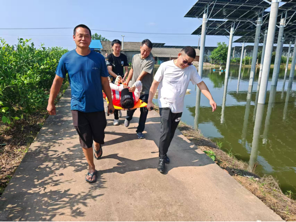 演练模拟某村因洪水倒灌,村内一位行动不便且独居的老人未能及时撤离,被困在家中。救援组携带担架、救生衣等迅速前往被困地点,将被困老人救援至安全地点。随后,卫生院医护人员对老人进行身体检查和基础护理。
