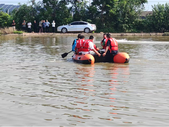 随后,模拟了持续暴雨致使乡镇河道水位急剧上升,有村民被困在河道中央的一处高地上。救援组接到指挥组指令后,迅速携带橡皮艇、遥控救生圈等救援工具。使用安全可靠的转移方式将村民转移至橡皮艇上,平稳护送回岸边安全区域。