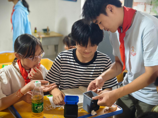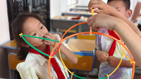 在“科技创新课”上,孩子们兴致勃勃地利用吸管等简易材料完成科技小制作,团队成员们全程指导,现场充满欢声笑语,既锻炼动手能力又培养创新思维。