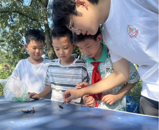 团队精心设计了系列科普实践活动,在“认识昆虫”户外课堂中,孩子们在志愿者带领下观察自然生态。