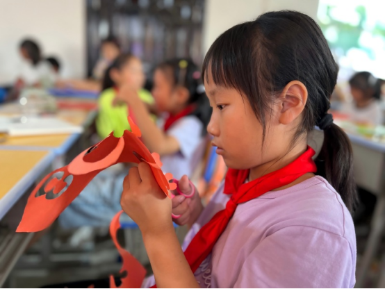 “指尖非遗,千年剪影工坊”课堂上,孩子们专注地进行剪纸创作。在团队志愿者指导下,一张张红纸变成栩栩如生的图案,传统技艺的种子悄然播撒在心田。