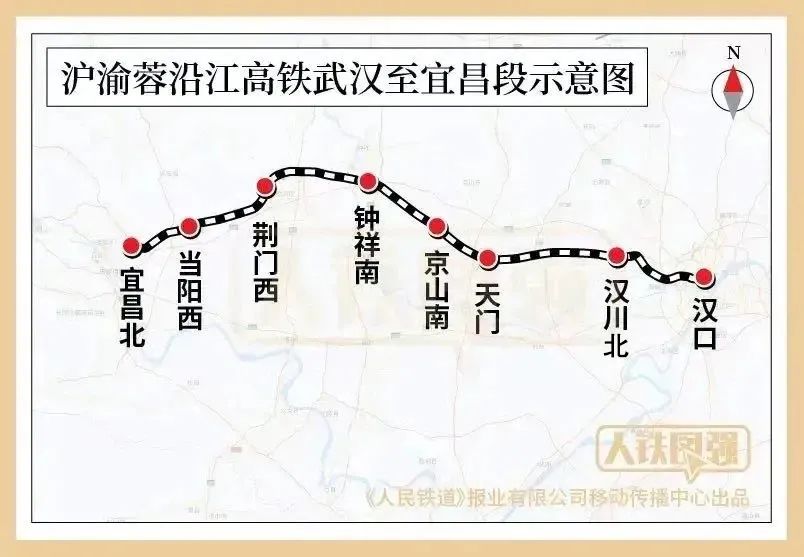 ▲汉襄宜高铁环线示意图。图片来源:湖北日报 武宜高铁是沿江高铁全线首个开工的项目,线路东起汉口站,西至宜昌北站,正线全长313公里、设计时速350公里,沿线设汉口(既有)、汉川北、天门、京山南、钟祥南、荆门西、当阳西、宜昌北8座车站,是沿江高铁首个即将建成开通的项目。
