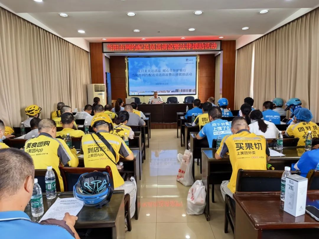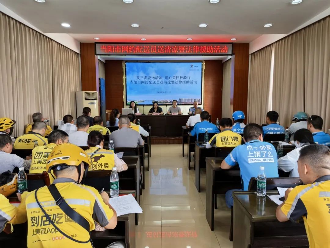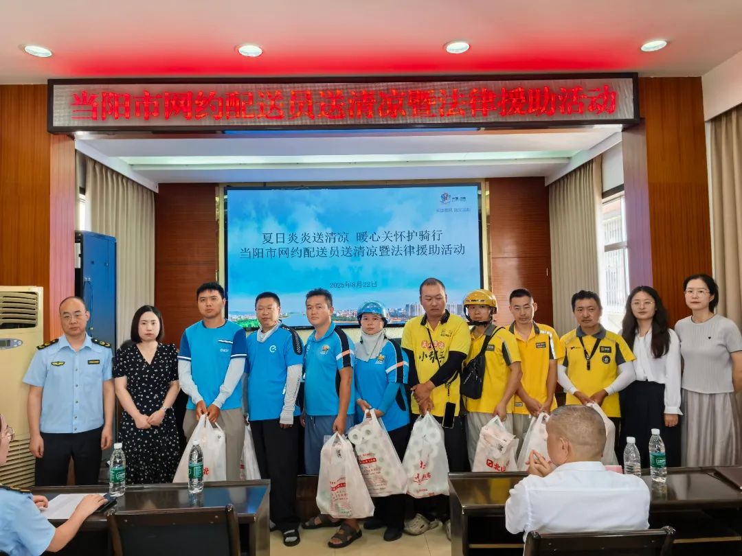 8月22日,当阳市委社会工作部联合当阳市市场监管局、当阳市司法局、当阳市妇联共同举办当阳市网约配送员送清凉暨法律援助活动,为当阳220名网约配送员送上防暑降温物资,并现场组织开展法律援助专题讲座。活动特邀湖北弘发律师事务所许刚耀律师,围绕交通事故处理、工伤认定及劳动关系等常见法律知识,为50余名到场骑手代表带来了一堂实用、生动的法治课,切实帮助新就业群体提升法律意识和自我保护能力。