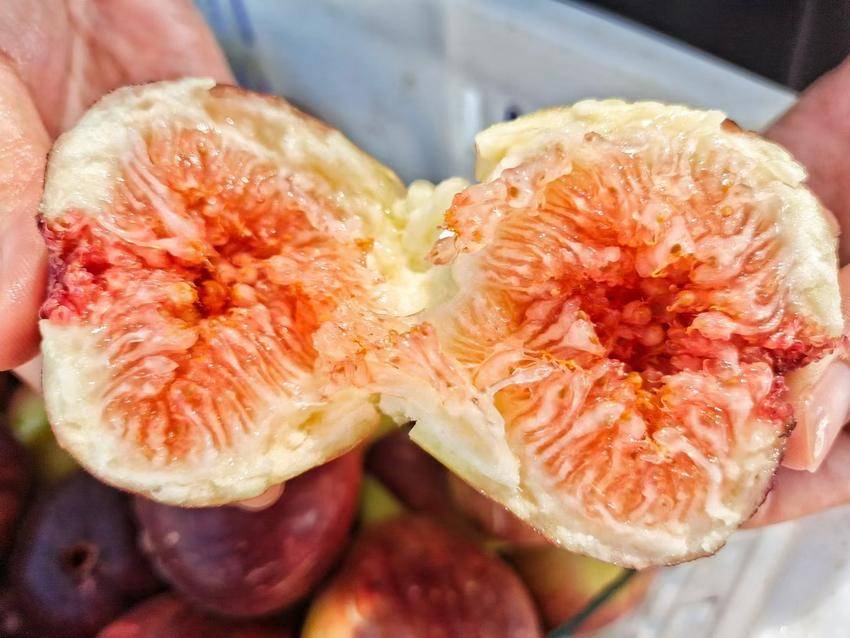 当海藻梨采摘进入尾声,果园的无花果园区迎来盛果期。波姬红、玛斯义陶芬、巴劳奈等多个品种的无花果挂满枝头,或紫红如玛瑙,或青绿似翡翠,形态各异的果实藏于掌状叶片间,别具田园意趣。不同于常见水果,无花果果肉呈蜂窝状,口感绵密软糯,虽糖度适中却富含膳食纤维、钾和钙等元素及蛋白酶,兼具润肠通便、促进消化等食疗功效,成为注重健康养生人群的心头好。