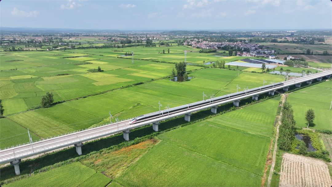 8月26日,试验列车经过当阳庙前镇旭光村。 方梓轩 / 摄 全线共设8座车站,其中汉口站为既有站,汉川北、天门、京山南、钟祥南、荆门西、当阳西、宜昌北为新建车站。荆门西站部分工程已随荆荆高铁于2024年底投用。