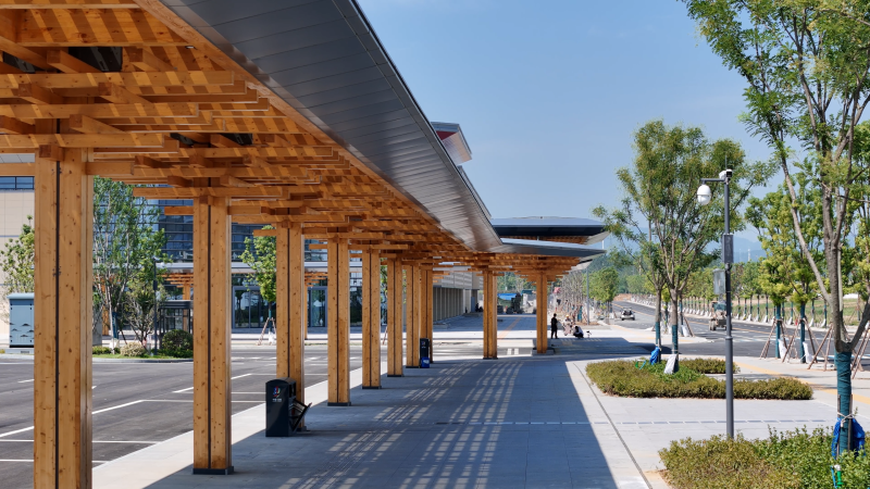 如果刚刚抵达当阳西站想去当阳市区,穿过风雨连廊,即可到达旅游集散中心和城西客运站。据工作人员介绍,贯穿整个广场的风雨连廊主体结构采用钢木结构,屋顶则满铺太阳能光伏板,在践行低碳节能设计理念的同时,也满足材料的安全性、清洁性和耐久性要求。值得一提的是,为了让旅客出站到站前广场后,能够全程无风雨换乘,站前广场风雨连廊的设计方案经过多次优化,目前可以完全覆盖旅客换乘公交车、出租车、网约车及长途客运车的所有路径。