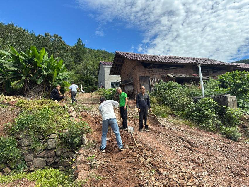 现场,几座颇具乡村特色的民居坐落在绿意盎然的山脚下,蓝天白云的映衬下,村民们的身影格外动人。“每到雨季,这片坡地就容易积水,不仅影响出行,还可能对周边作物和房屋造成损害。”参与挖沟的村民说道。得知这一情况后,江范村的村民们自发组织起来,利用闲暇时间投身到沟渠开挖工作中。