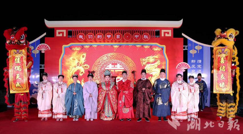 颇具特色的中式婚礼展示紧跟其后,新郎新娘身着传统的中式礼服,新娘头戴凤冠,身披红色霞帔,新郎身着红色长袍,头戴礼帽,在大家的见证下,完成了拜堂、敬茶、合卺酒等传统仪式。婚礼的每个细节都充满了浓厚的文化气息,展现了中式婚礼的庄重与典雅,让广大游客近距离感受到“穿越时光”的浪漫。