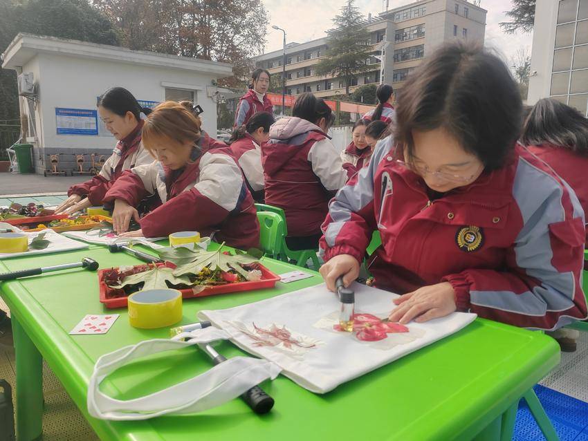 活动尾声的“寻迹自然·印记留芳”非遗文化体验环节成为一大亮点。宋晶老师详细讲解了植物拓印的非遗文化背景、工具使用方法及创作技巧,随后带领教师们分组前往小树林采集自然素材,动手开展植物拓印实践。大家充分发挥创意,将花草的纹理与色彩定格在画布上,在亲身实践中感受传统文化的魅力。