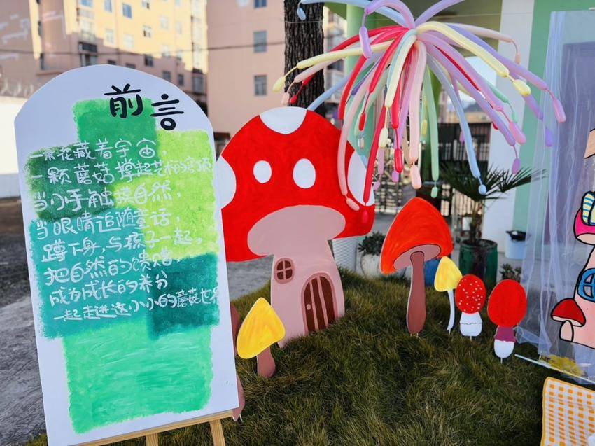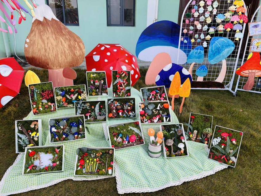 蘑力绽放·草坪彩菇园:废旧鸡蛋托经过涂色、剪裁,变身五颜六色的“小蘑菇”,孩子们将其插进草坪,打造出一片童趣盎然的“彩菇园”;