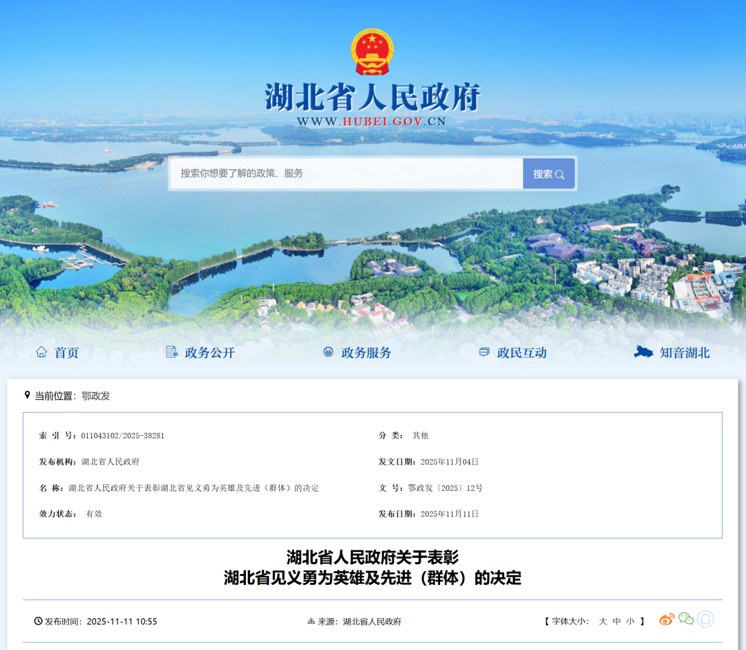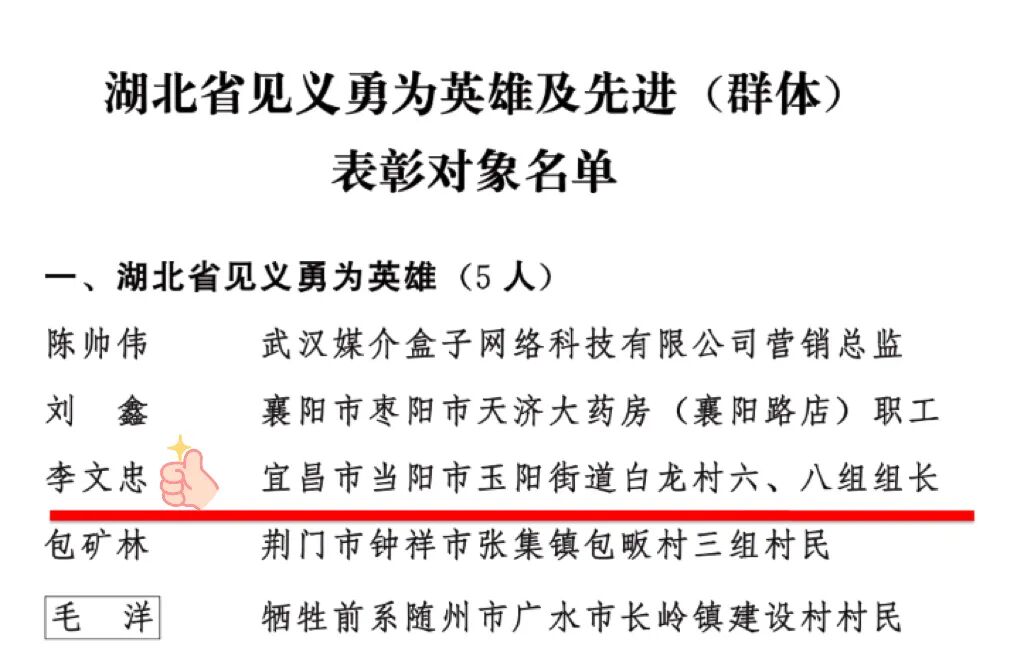 近日 湖北省人民政府发布 关于表彰湖北省见义勇为英雄及先进(群体)的决定 当阳市玉阳街道白龙村六、八组组长李文忠 被授予 “湖北省见义勇为英雄”称号