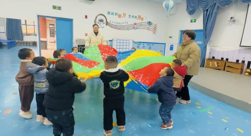 趣味游戏,畅享冬日趣味。老师展开色彩鲜亮的彩虹伞,撒上细碎的白纸屑当作“雪花”。萌娃们围在伞边,紧紧攥住伞沿,跟着老师的口令一起抖动手臂。随着伞面起伏,“雪花”漫天飞舞,纷纷扬扬飘落在孩子们的头顶、肩膀上。现场欢呼声、笑声此起彼伏,萌娃们追着“雪花”跑跳嬉戏,伸手接住飘落的“雪花”,又笑着松开小手任其飞扬,在尽情的奔跑与欢笑中,畅享冬日游戏的纯粹快乐。