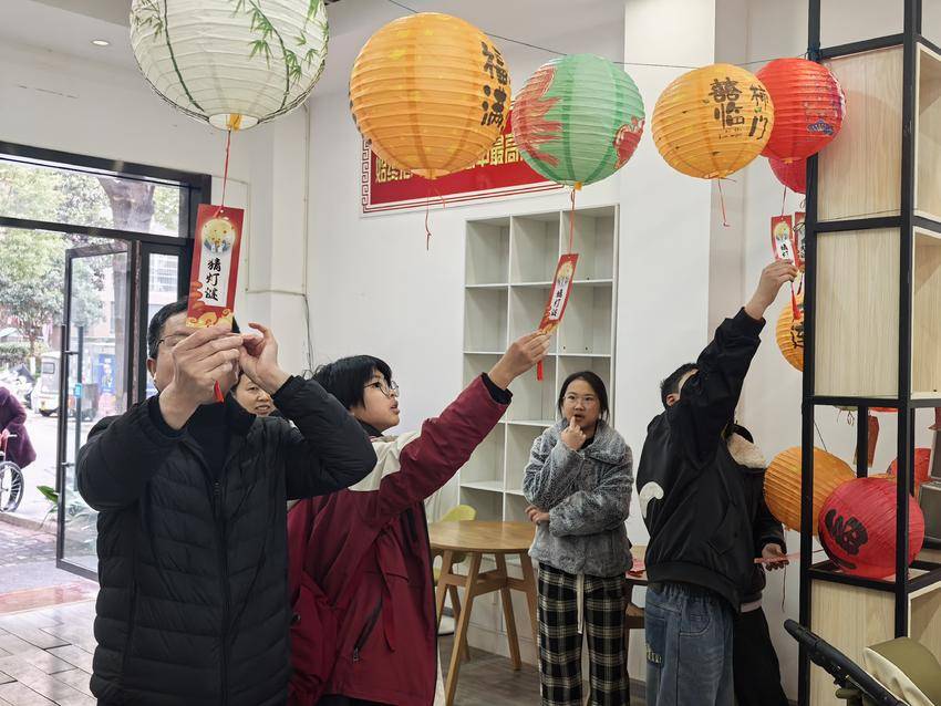 活动现场张灯结彩,年味浓郁。五彩斑斓的灯笼高高悬挂,红彤彤的灯谜条随风摇曳,猜灯谜区域里,孩子们围着灯笼认真思索,时而与家长低声讨论,时而兴奋地喊出答案,传统文化的智慧与趣味在亲子互动中悄然传递;投壶、“下汤圆”等游戏区更是排起了长队,亲子携手闯关,默契配合。社区工作人员与志愿者们全程贴心服务,不仅耐心引导活动流程,还为参与的居民们准备了丰富的奖品,人人有礼的设置让每一位参与者都收获了满满的喜悦与成就感。