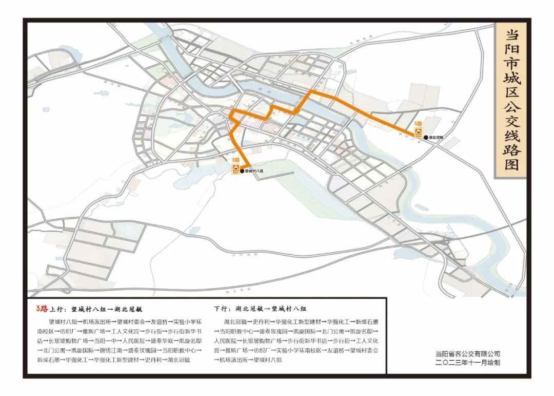 湖北冠毓—望城村八组:湖北冠毓—史丹利—华强化工新型建材—华强化工—新成石墨—当阳职教中心—盛泰玫瑰园—凯旋国际—北门公寓—凯旋名邸—人民医院—长坂坡购物广场—步行街新华书店—步行街—工人文化宫—雅斯广场—纺织厂—实验小学环南校区—友谊桥—望城村委会—机场派出所—望城村八组