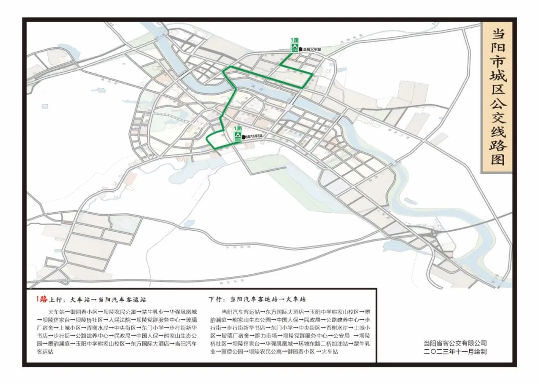 火车站—汽车客运站:当阳火车站—御园春小区—坝陵农民公寓—蒙牛乳业—华强凤凰城—坝陵佟家台—坝陵桥社区—人民法院—坝陵党群服务中心—玻璃厂宿舍—上城小区—香榭水岸—中央街区—东门小学—步行街新华书店—步行街—公路建养中心—民政局—中国人保—熊家山生态公园—墨韵澜庭—玉阳中学熊家山校区—东方国际大酒店—当阳汽车客运站