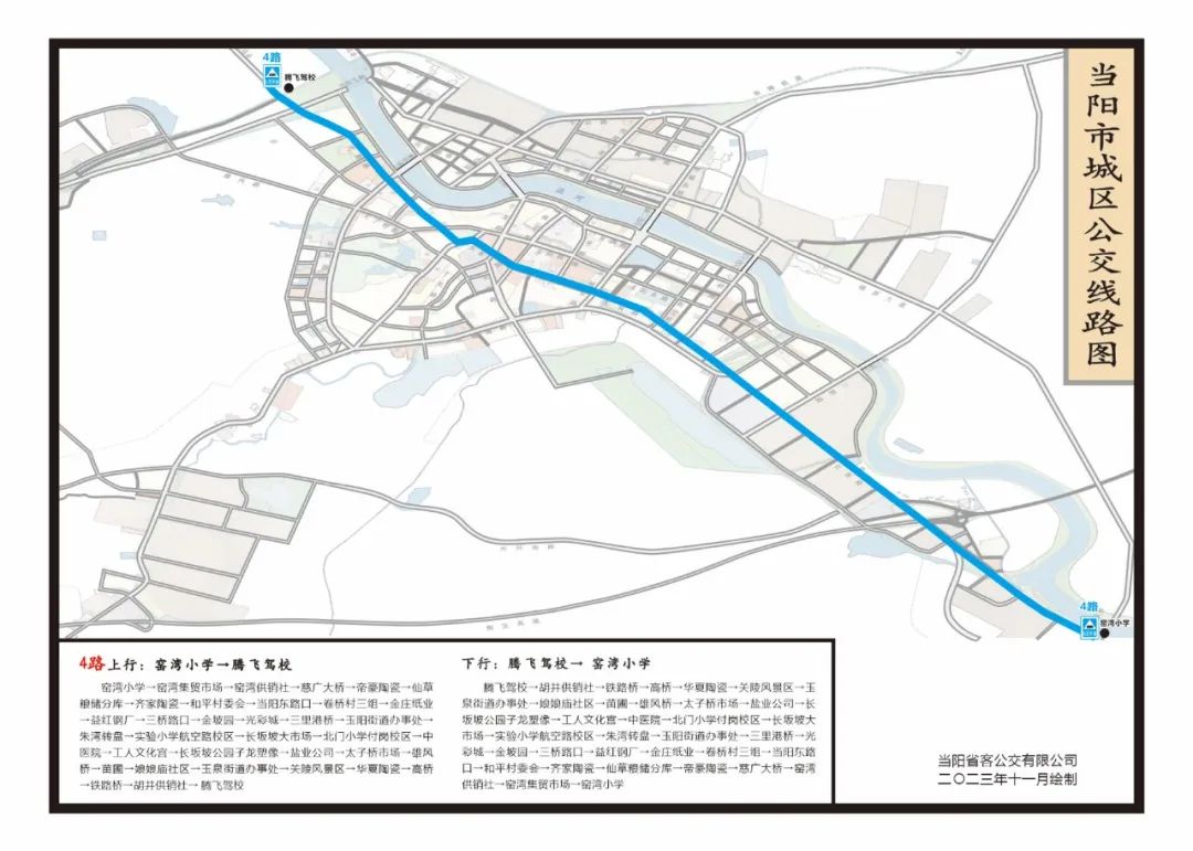窑湾小学—腾飞驾校:窑湾小学—窑湾集贸市场—窑湾供销社—慈广大桥—帝豪陶瓷—仙草粮储分库—齐家陶瓷—和平村委会—当阳东路口—卷桥村三组—金庄纸业—益红钢厂—三桥路口—金坡园—光彩城—三里港桥—玉阳街道办事处—朱湾转盘—实验小学航空路校区—长坂坡大市场—北门小学付岗校区—中医院—工人文化宫—长坂坡公园子龙塑像—盐业公司—太子桥市场—雄风桥—苗圃—娘娘庙社区—玉泉街道办事处—关陵风景区—华夏陶瓷—高桥—铁路桥—胡井供销社—腾飞驾校