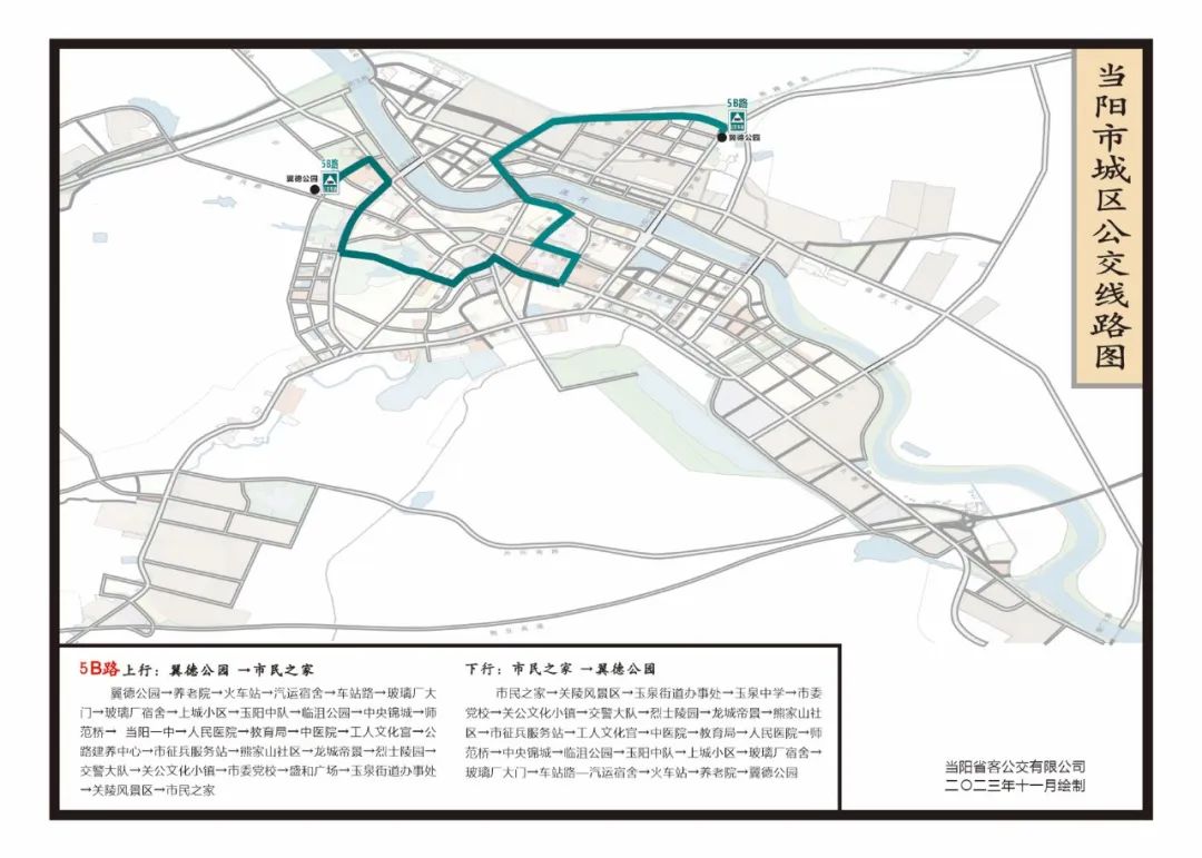 市民之家—翼德公园:市民之家—关陵风景区—玉泉街道办事处—玉泉中学—市委党校—关公文化小镇—交警大队—革命烈士陵园—龙城帝景—熊家山社区—市征兵服务站—工人文化宫—中医院—教育局—人民医院—师范桥—中央锦城—临沮公园—玉阳中队—上城小区—玻璃厂宿舍—玻璃厂大门—车站路—汽运宿舍—火车站—养老院—翼德公园