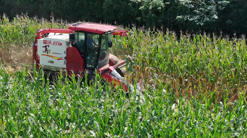 在当阳市河溶镇玉米种植基地,连片的玉米地丰收在即,一台台玉米收割机在农田里来回穿梭,一排排玉米植株连秆带穗被卷入收割机中,经过收割、摘棒等作业程序,一穗穗颗粒饱满、色泽金黄的玉米粒倾泻而出,很快就装满运粮车。