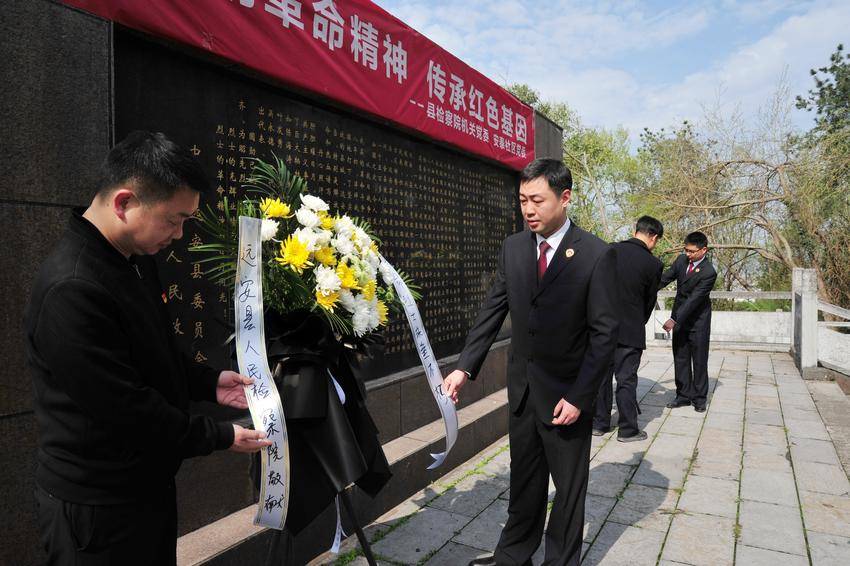 青山埋忠骨,丰碑铸英魂。伴随着深情的《献花曲》,县人民检察院党组书记、检察长王谦,安泰社区党委书记郭勇共同托起花篮,缓步走上台阶,将花篮摆放在革命烈士纪念碑前,随后,全体人员依次向烈士献花,一束束鲜花饱含着大家对烈士们的无限敬意和深切怀念。