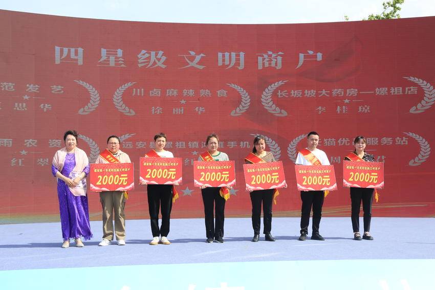 湖北日报客户端讯(通讯员:黄家顺)4月23日下午,嫘祖镇“弦歌颂嫘祖 艺起向文明”文艺惠民演出活动在清廉文化广场如期举行。在文艺节目表演中,还开展了一季度“嫘祖镇文明商户”评选表彰活动,共表彰五星级3户、四星级6户、三星级17户,为表彰对象给予了现金奖励,并颁授“嫘祖镇文明商户”奖牌和荣誉绶带。