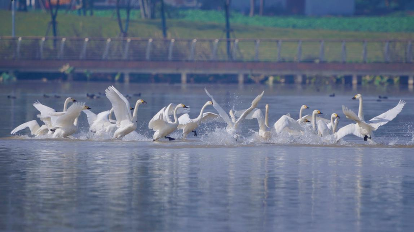 图为成群结队的天鹅在季家湖嬉戏玩闹