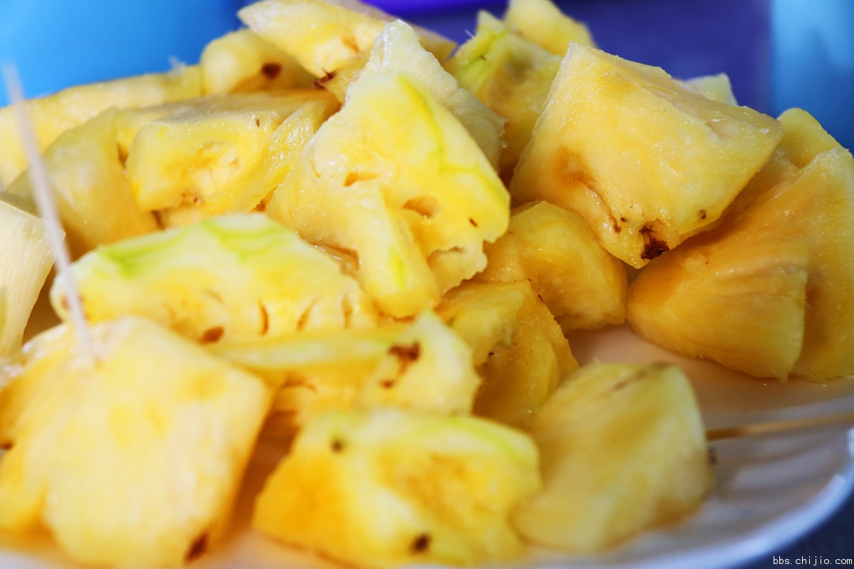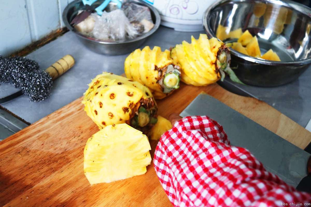 当时,谢姐还现场削了好几个菠萝让我们品尝,奇怪的是她并没有像街上卖菠萝的那样,把菠萝用盐水浸泡后给我们品尝,而是直接让我们入口的,没想到入口香香甜甜的,一点也没有街上摊贩说的不泡盐水会很酸的感觉。