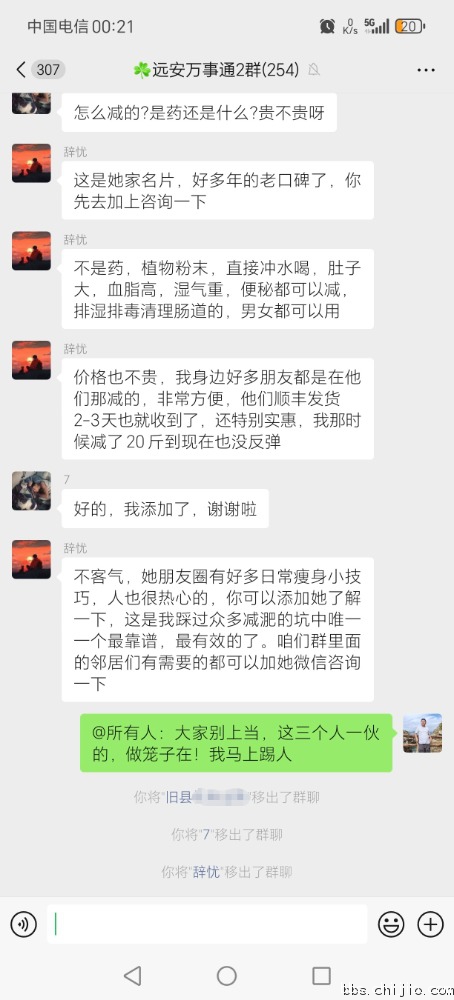 正准备睡捉了,突然听见我的手机噼里啪啦、叮叮当当响,信息一大堆,很不寻常!凭借我多年以来的职业敏感,我断定又是半夜搞诈骗的来了!我打起十二分精神,起身下床,拿出手机翻开来,连夜出击! 在我打开微信一看,果不其然!几个人在我远安万事通的群里刷屏忽悠人,真是在太岁头上动土,找死!他们挺狡猾的,合起伙来串台词,假借中医养胃健康调理,一唱一和的在那儿假演,去年就有类似的骗局出现过,不知道的,很容易白白损失钱财!最可恨的是,两个诈骗同伙是被远安旧县一网友拉进来的,这就很过分了!都说中国人不骗中国人,结果上当受骗的没有一件是外国人干的! 作为群主,我有责任和义务维护正义、监督群聊!我越想越气,索性把聊天截图和旧县网友账号公布出来,通过临沮论坛公布于众、进行曝光,也把这三个人及时踢出群了,避免再有远安老乡上当受骗!也希望大家多多支持我的善举,在此谢过!我是董家瑞,小飞侠家政的老板,我也是星辰房地产的卖房小董。今天我鼓起勇气实名揭露,就是为了更好的帮大家守住钱袋子,我不希望再有人被这种龌龊而又老套的中医骗局给骗了,需要就医和养生,请通过正规渠道!毕竟当下的大环境依然不好,我们每个人挣的每分钱都十分不容易!!小董再次提醒大家:看我发的截图,提醒身边朋友,别再上当受骗!!!