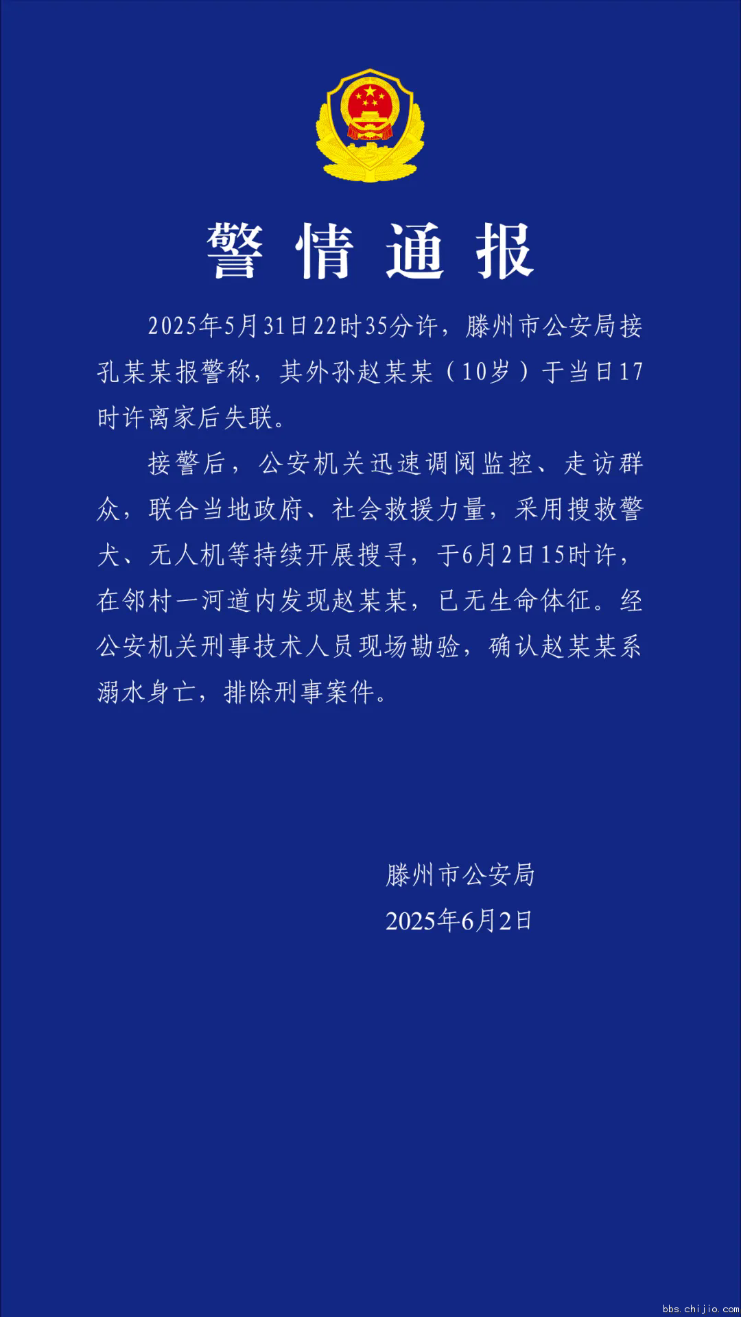 [国内] 10岁男孩儿童节前走失,警方通报:溺亡,排除刑案 |
