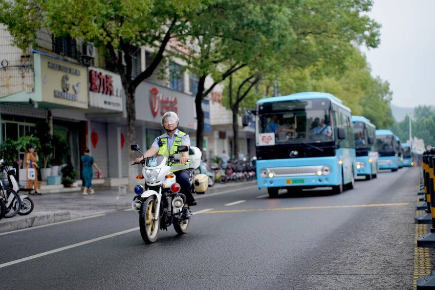 民警护送考生车队 考试期间,远安公安对考场周边的主要路段全部实行临时交通管制,对重点路段摆放“禁鸣”提示牌,严禁车辆鸣号通行,民警对该县职教中心308名走读考生进行安全护送,确保考生生命和财产安全。