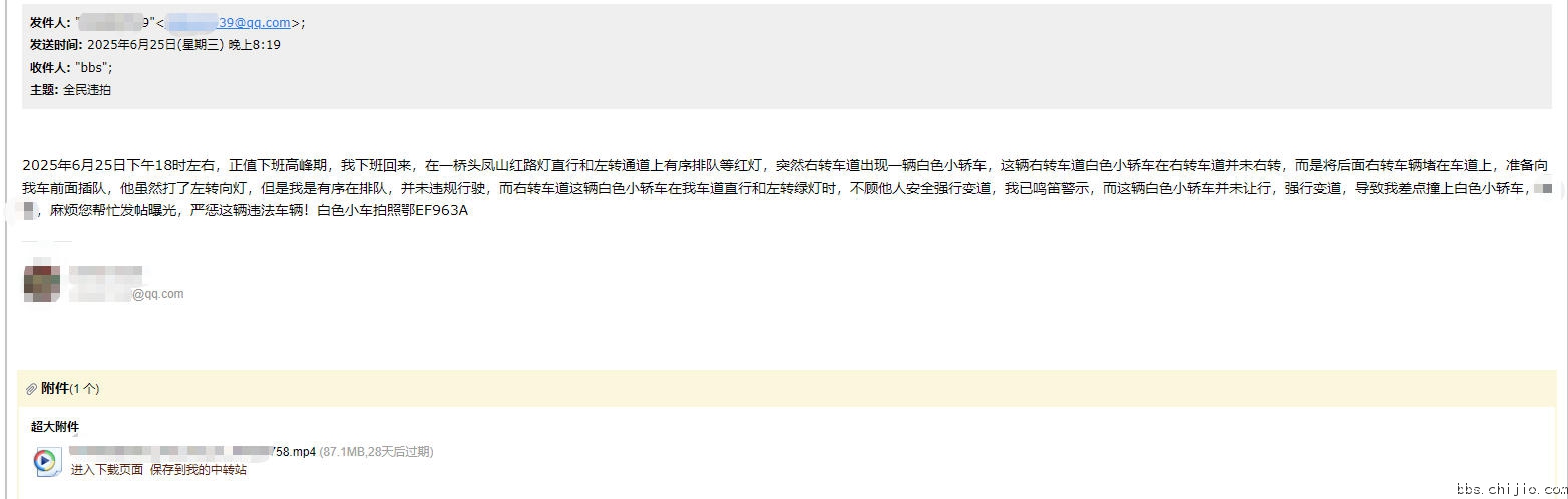 2025年6月25日20点19分,有网友通过论坛邮箱(bbs@@yalj.net)发来一起交通违法行为:2025年6月25日下午18时左右,正值下班高峰期,我下班回来,在一桥头凤山红绿灯直行和左转通道上有序排队等红灯,突然右转车道出现一辆白色小轿车,这辆右转车道白色小轿车在右转车道并未右转,而是将后面右转车辆堵在车道上,准备向我车前面插队,他虽然打了左转向灯,但是我是有序在排队,并未违规行驶,而右转车道这辆白色小轿车在我车道直行和左转绿灯时,不顾他人安全强行变道,我已鸣笛警示,而这辆白色小轿车并未让行,强行变道,导致我差点撞上白色小轿车。版主,麻烦您帮忙发帖曝光,严惩这辆违法车辆!白色小车牌照鄂EF963A。 以下是网友提供的行车记录仪视频 视频截图