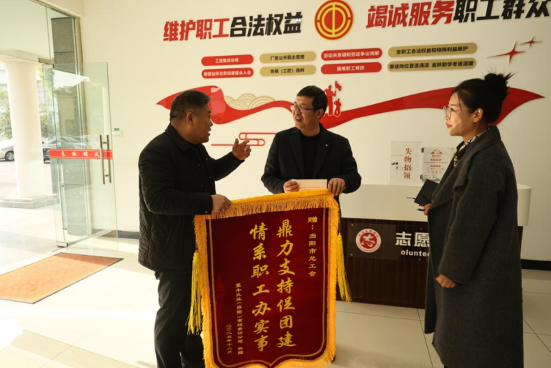 湖北日报客户端讯(通讯员 陈贵莲 简林)“真的太感谢你们了!多亏了你们的鼎力支持,我们的劳动竞赛和红色教育活动才能如此顺利!”12月3日,蒙牛乳业(当阳)有限责任公司相关负责人来到当阳市总工会综合服务大厅,将一面写有“鼎力支持促团建、情系职工办实事”的锦旗交到当阳市总工会负责人手中,言语中充满感激。