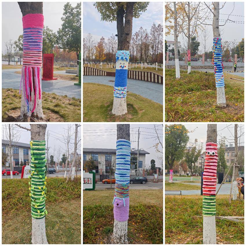 二、公园焕新:自然美学与生态实践 在公园绿地管理中,我们注重融合实用养护与景观艺术,积极探索废弃物资源化利用模式,赋予冬日公园别样生机与趣味。 创意微更新,点缀冬日色彩 在仪兴公园这一市民喜爱的休闲空间,我们尝试对部分树木进行适度的创意装饰。例如,为几株形态优美的树木“穿戴”上手工编织的彩色毛线装饰,在萧瑟冬季中注入温暖明亮的视觉元素,营造出充满童趣与艺术感的节点景观,深受游客尤其是孩子们的喜爱。