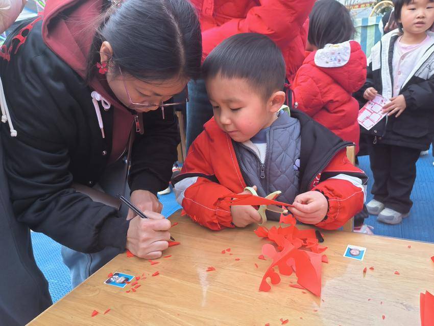 区域活动环节是本次活动的核心亮点。智慧福区里,猜灯谜妙趣横生,马掌配对挑战思维,不同年龄段设置了不同难度,让幼儿在游戏中锻炼脑力;巧手福区中,剪窗花、写马字活动激发了幼儿的创造力,小、中、大班各有特色任务,孩子们在家长指导下完成作品,收获满满成就感;健康福区的“一马当先”比赛和“打年兽”游戏,让亲子携手竞技,在运动中增进默契、强健体魄;成长福区设置穿鞋、叠被、整理玩具等关卡,培养了幼儿的生活自理能力;新年福区则充满文化韵味,亲子写福字、体验写对联,感受传统文化的魅力。
