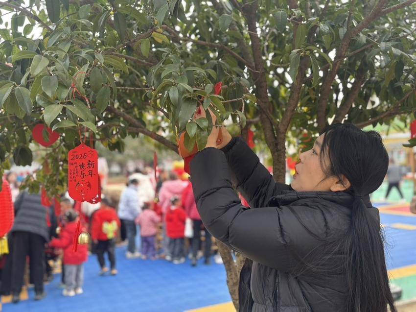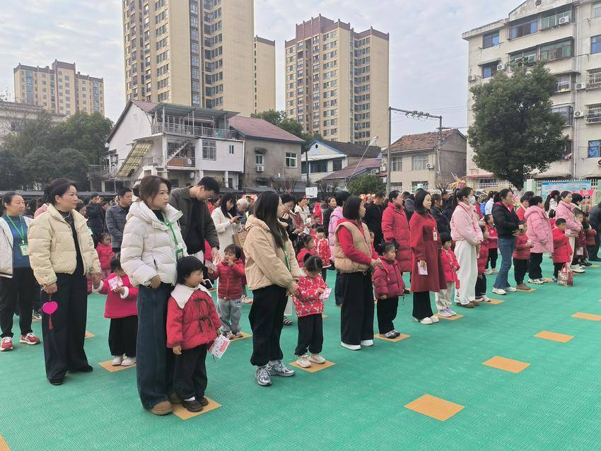 活动开场,主持人热情致辞,介绍活动主题、流程与集福规则——集满“智慧福、巧手福、健康福、成长福、新年福”五福可兑换新年美味小吃,园长随后送上新年祝福。接着,亲子律动小游戏点燃现场气氛,亲子悬挂福牌环节更添温馨,大家将写满新年愿望的福牌挂起,寓意新的一年福气满满。