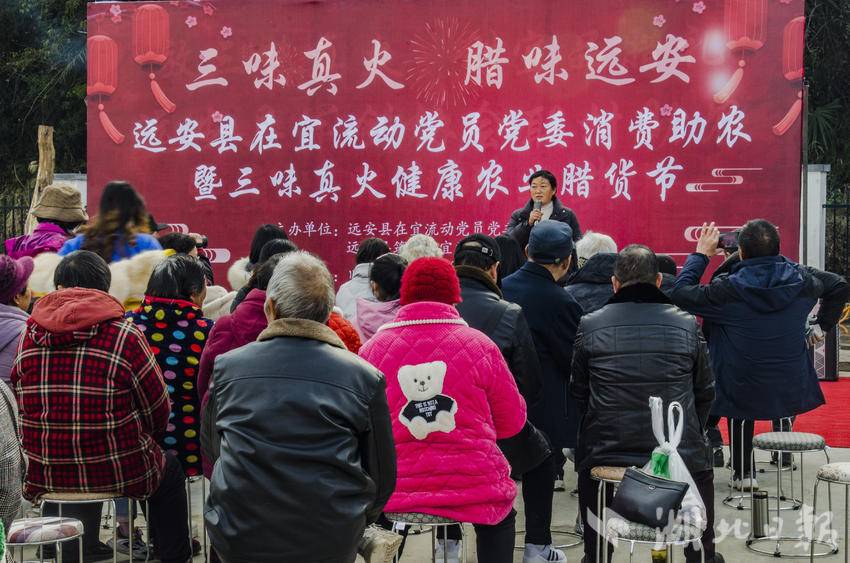 湖北日报客户端讯(通讯员钱程)1月10日,远安县在宜流动党员党委联合远安县筑梦在宜党群工作服务中心、远安县军创协会、旧县镇董家村、宜昌三味真火健康农业发展有限公司,举办“三味真火 腊味远安”消费帮扶暨腊货节活动。本次活动旨在发挥流动党员先锋模范作用,畅通农副产品销售渠道,推动村级产业发展,共计吸引了宜昌市区流动党员、外地游客等120余人参加。